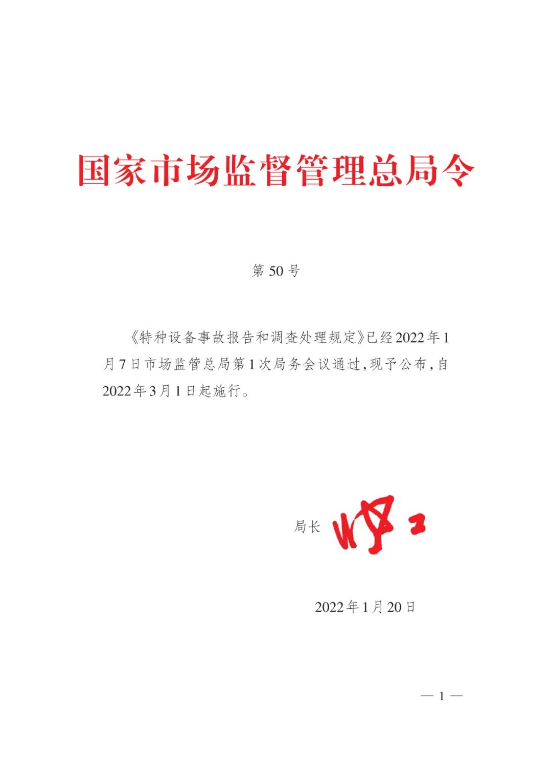 《特種設備事故報告和調查處理規定》已經2022年1月7日市場監管總局第1次局務會議通過,現予公布,自2022年3月1日起施行。