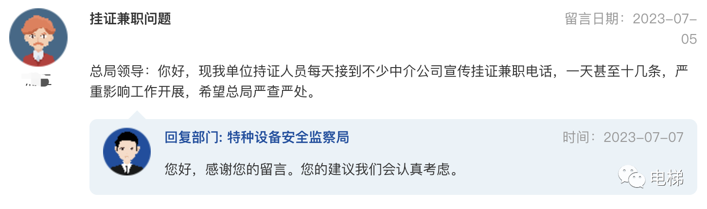 問:掛證兼職問題 總局領(lǐng)導(dǎo):你好,現(xiàn)我單位持證人員每天接到不少中介公司宣傳掛證兼職電話,一天甚至十幾條,嚴(yán)重影響工作開展,希望總局嚴(yán)查嚴(yán)處。 總局回復(fù):您好,感謝您的留言。您的建議我們會(huì)認(rèn)真考慮