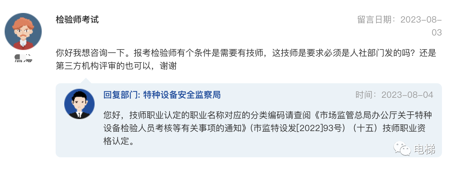 問:你好我想咨詢一下。報(bào)考檢驗(yàn)師有個(gè)條件是需要有技師,這技師是要求必須是人社部門發(fā)的嗎?還是第三方機(jī)構(gòu)評(píng)審的也可以,謝謝 總結(jié)回復(fù):您好,技師職業(yè)認(rèn)定的職業(yè)名稱對(duì)應(yīng)的分類編碼請(qǐng)查閱《市場監(jiān)管總局辦公廳關(guān)于特種設(shè)備檢驗(yàn)人員考核等有關(guān)事項(xiàng)的通知》(市監(jiān)特設(shè)發(fā)[2022]93號(hào)) (十五)技師職業(yè)資格認(rèn)定。