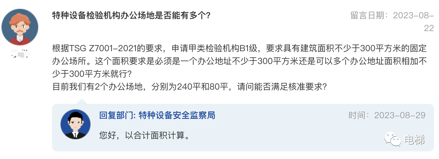 問:特種設(shè)備檢驗(yàn)機(jī)構(gòu)辦公場地是否能有多個(gè)? 根據(jù)TSG Z7001-2021的要求,申請(qǐng)甲類檢驗(yàn)機(jī)構(gòu)B1級(jí),要求具有建筑面積不少于300平方米的固定辦公場所。這個(gè)面積要求是必須是一個(gè)辦公地址不少于300平方米還是可以多個(gè)辦公地址面積相加不少于300平方米就行? 總局回復(fù):您好,以合計(jì)面積計(jì)算。